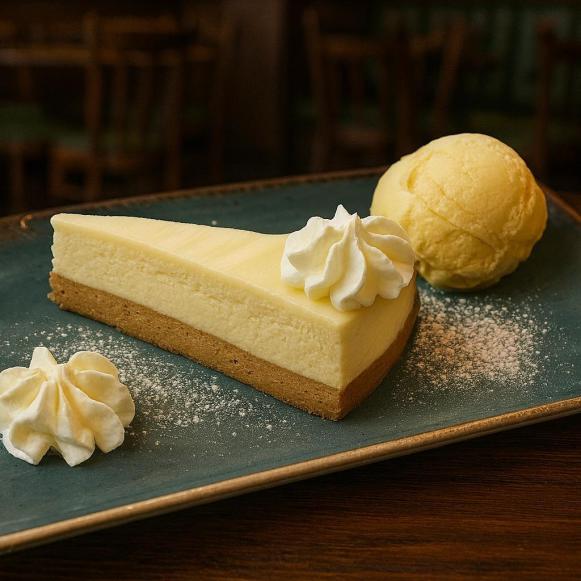 hausgemachter New York Style Baileys-Cheesecake mit Vanilleeis und Sahne